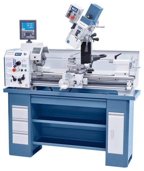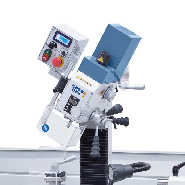 Das Modell Proficenter 880 G Vario ist serienmäßig mit einem Vorgelege ausgestattet, wodurch ein Wechseln der Drehzahlstufe mittels Keilriemen entfällt. Ein weiteres Merkmal dieser Maschine ist der serienmäßige Frequenzumrichter, wodurch ein hohes Drehmoment im unteren Drehzahlbereich und eine annähernd konstante Drehzahl unter Last gewährleistet wird. Bohren, Fräsen und Drehen auf kleinstem Raum, serienmäßig mit digitaler Anzeige für Bohrtiefe und Drehzahl zum komfortablen Arbeiten, sowie eine große Spindelbohrung, alles kombiniert in einer Maschine.
