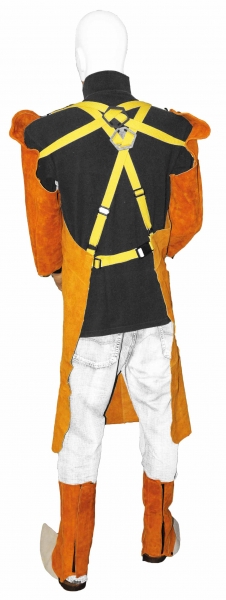 KEVLAR lángálló szállal varrott, növelt szikra és lángállóságú impregnált marhahasíték bőr, csatos nyak és derék keresztpánttal. 100°C kontakt hő elleni védelem (60 sec).