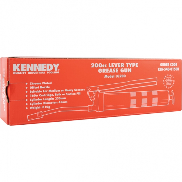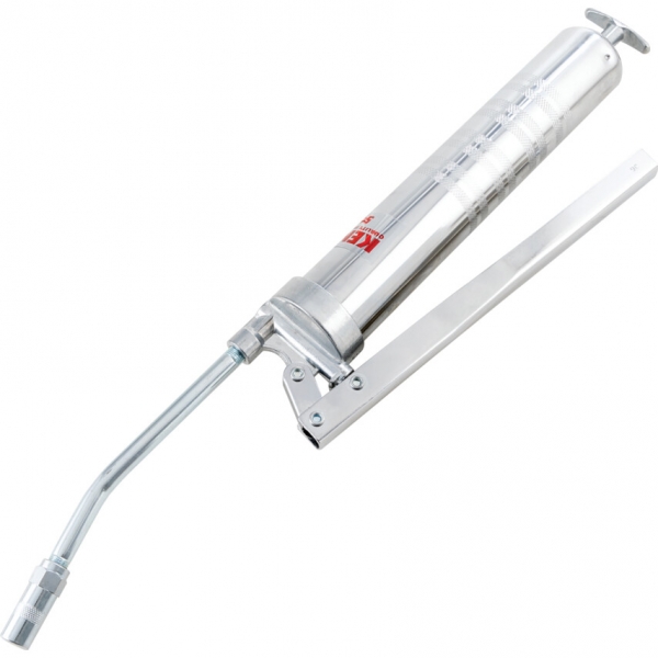 Króm bevonatú acél test és fogantyú, hajlított, merev kinyomófej. Patronos vagy felszívó utántöltés. Alkalmas közepes/nehéz ken'zsírokhoz. Üzemi nyomás: 3000 psi/206 bar. Átmér': 45mm. Teljes hossz: 300mm.